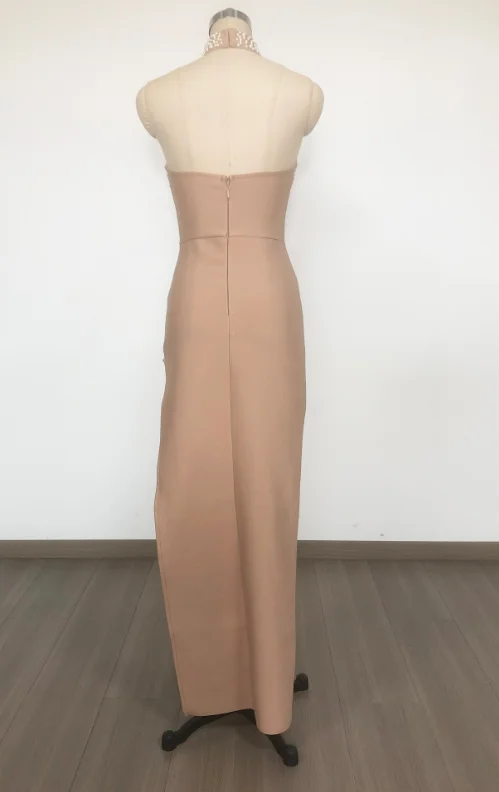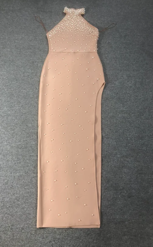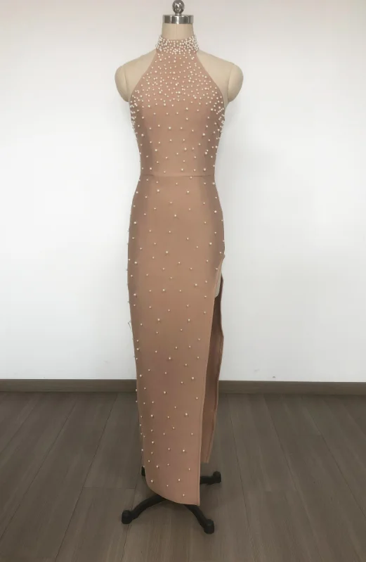 SB3627 Kimshein High Quality New Arrivals Elegant Pearls Beading Sexy High Slit Bodycon Bandage Dress